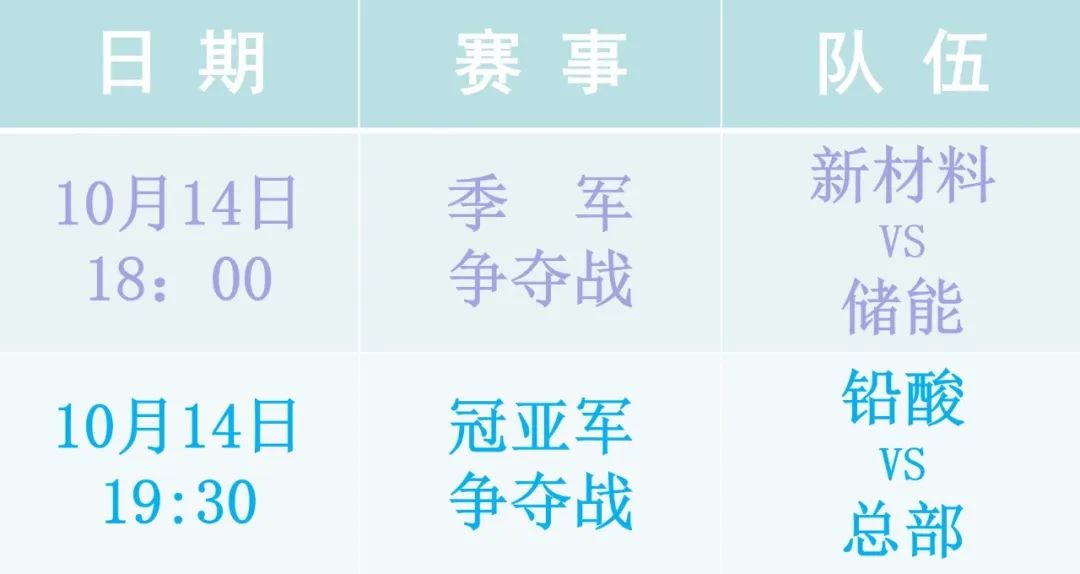 2.冠亚军争夺战将于10月14日19:30至21:00举行,由铅酸代表队对阵总部代表队;